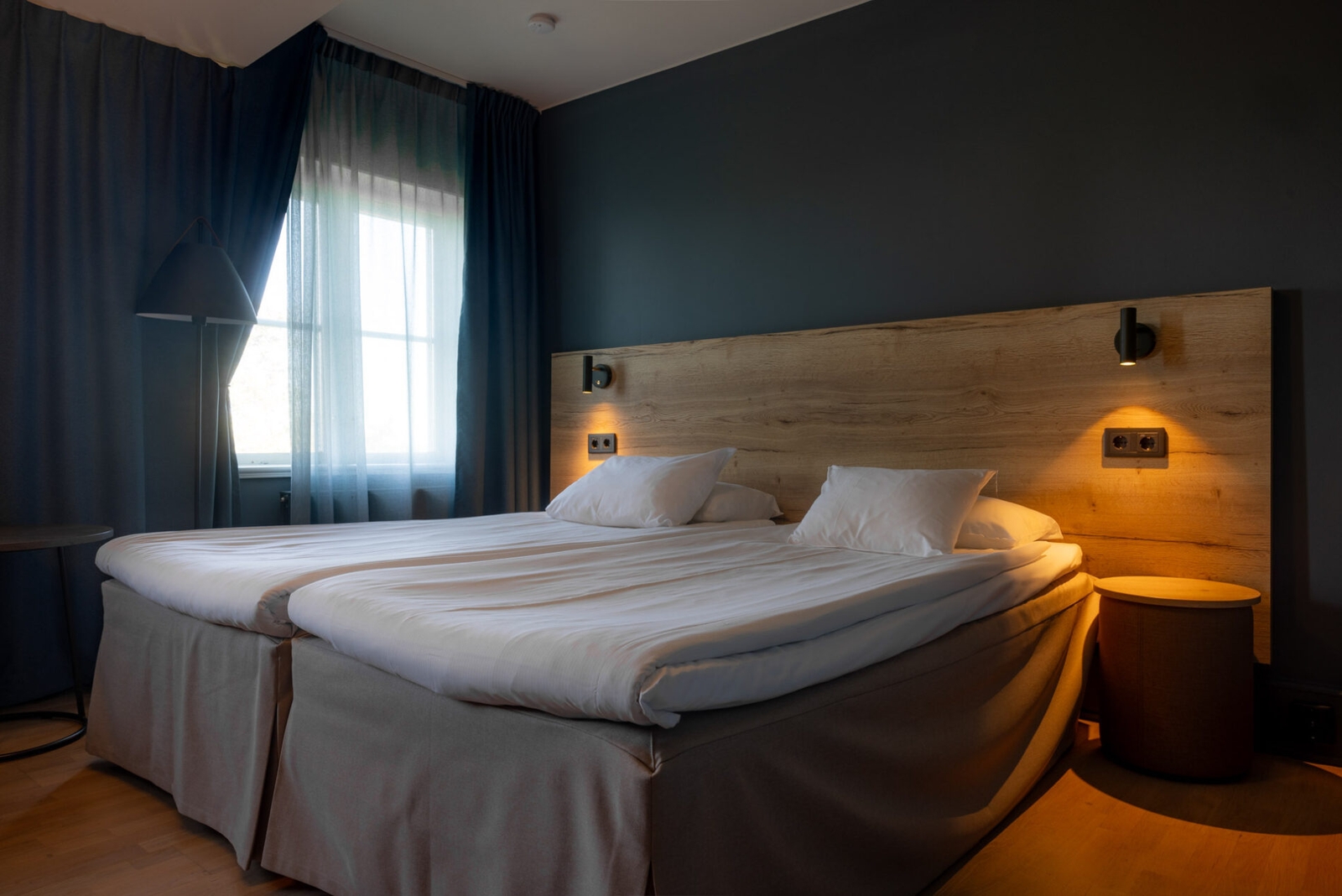 Våra dubbelrum ekonomi är mellan 18 och 20 kvm stora. Rummen har enklare standard med två enkelsängar som står intill varandra, arbetsbord och badrum med dusch. På alla våra rum finns kaffe- och tebryggare. Här bor du med utsikt mot Pallisadparken, ringmuren och Visby innerstad. Självklart ingår också vår generösa frukostbuffé.