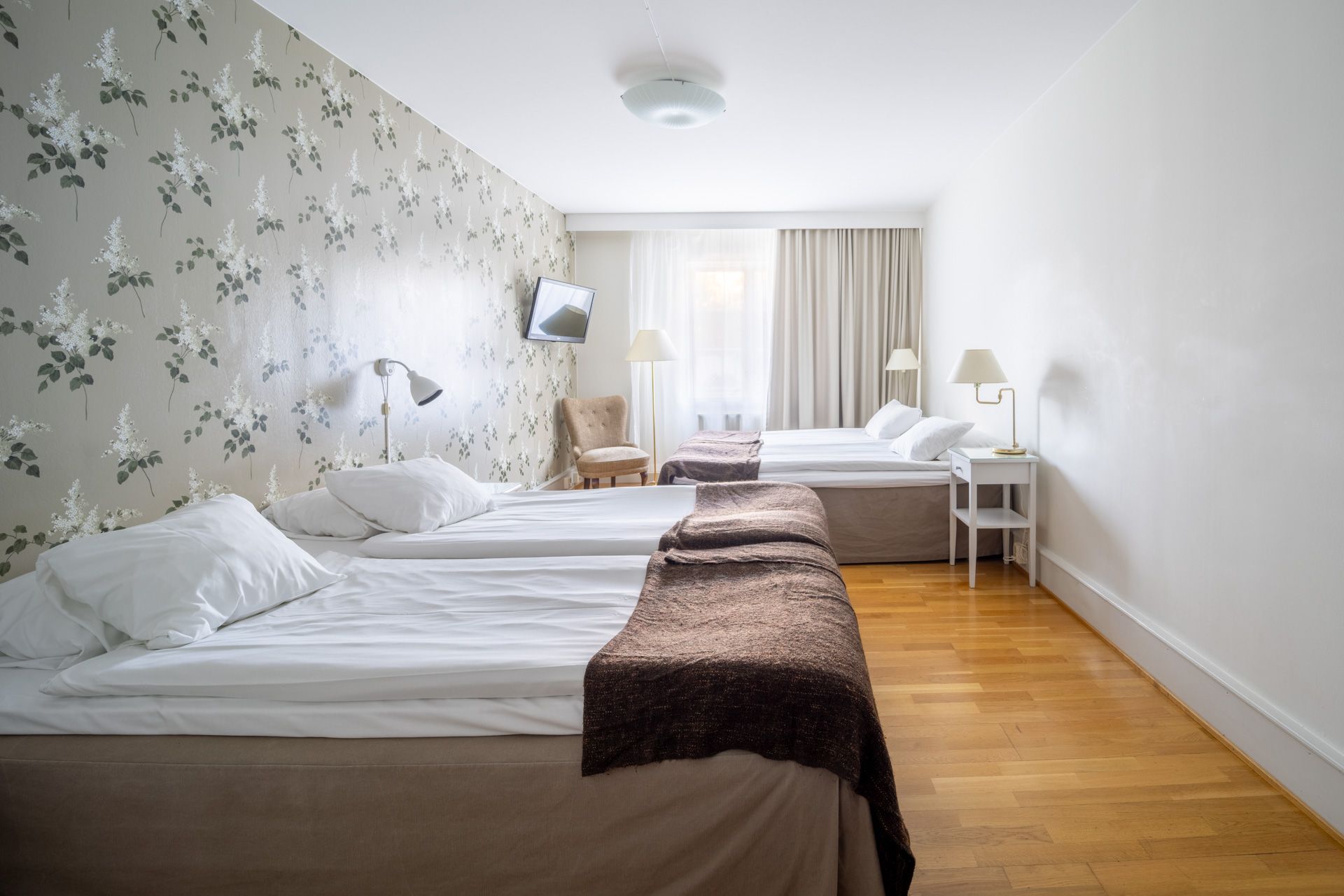 Våra familjerum är mellan 25 och 30 kvm. Här får upp till fyra personer plats att sova. Sängplatserna i familjerummen varierar, utöver två sängar som står intill varandra kan det finnas en våningsäng eller ytterligare två sängarna som står intill varandra. Rummet har arbetsbord, bagagehylla och badrum med dusch. På alla våra rum finns kaffe- och tebryggare. Självklart ingår vår goda frukostbuffé för en bra start på dagen.